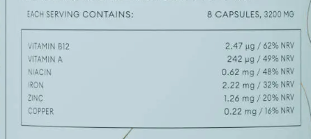 Innihald: Grasfóðraðar og frostþurrkaðar ostrur (40%), milta (30%), broddmjólk (10%), eggjastokkar (10%) og lifur (10%).