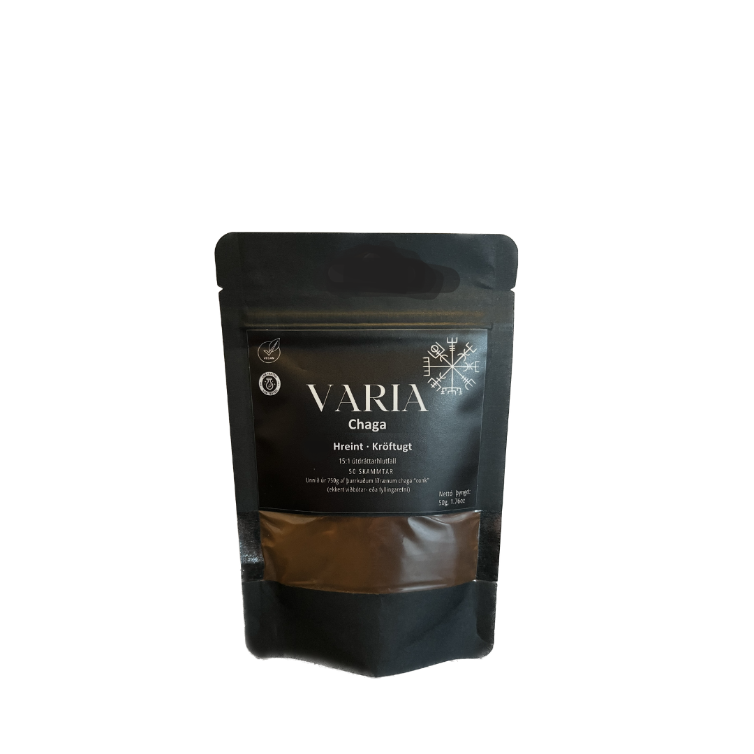 100% hreint Chaga extract duft unnið úr 750g af þurrkuðum "fruting bodies" engin viðbótar- eða fyllingarefni.