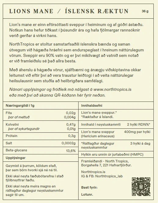Ræktað á Íslandi. Lion’s mane styður við taugakerfið með því að örva náttúrulega framleiðslu taugavaxtarþátta (NGF).
